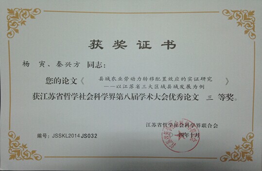 据扬州社科联网站报道:12月16日上午,江苏省哲学社会科学界第八届学术大会苏中片区分会在扬州召开。江苏省社科联党组副书记、副主席汪兴国,扬州市委常委、宣传部部长卢桂平,扬州大学副校长、苏中发展研究院理事会副理事长刘祖汉出席会议。来自南通、泰州、扬州三市的论文作者代表及扬州市社科类学会代表参加会议。本次分会共收到论文近500篇,入选大会60篇,其中评出优秀论文36篇。必赢官网青年教师杨寅报送的研究成果《县域农业劳动力转移配置效应的实证研究——以江苏省三大区域县域发展为例》荣获大会优秀论文三等奖。