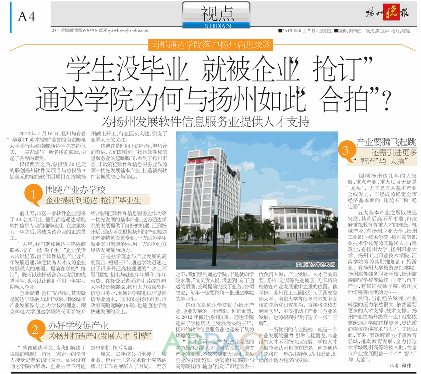 正是办学理念与产业发展的高度契合,短短三年,通达学院迅速走出了很多外迁高校遭遇的“水土不服”困扰,招生与就业年年攀升,年年火热。在接受记者采访时,南京邮电大学校长杨震说,扬州大力发展软件信息服务业,而通达学院也以信息通信专业为主,这不仅是扬州市委、市政府高瞻远瞩的布局,也是通达学院快速发展的沃土。