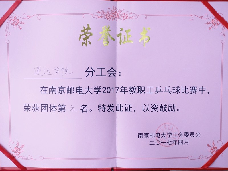4月22、23日,南京邮电大学教职工乒乓球比赛在仙林校区体育馆二楼举行。通达学院教职工乒乓球代表队斗志昂扬,奋勇拼搏,取得了团体第六名的好成绩。