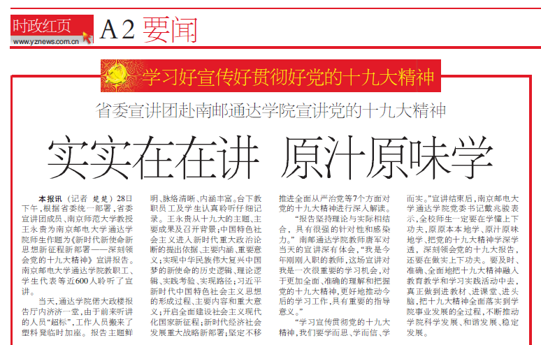 【扬州日报】省委宣讲团赴南邮通达学院宣讲党的十九大精神