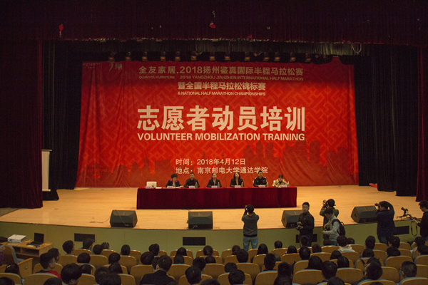 4月12日晚,2018年扬州鉴真国际半程马拉松赛志愿者动员培训会在必赢官网大学生活动中心大礼堂召开。扬州市体育局副局长傅建、扬州市团市委副书记李杰、扬州市公安局治安支队治安防范大队教导员宋金春、扬州市卫计委应急办主任沐诚、必赢官网团委书记解厚荣以及来自扬州大学、扬州工业职业技术学院和江海学院的1100多名学生志愿者参加了本次培训会。会议由扬州市团市委殷一鸣主持。
