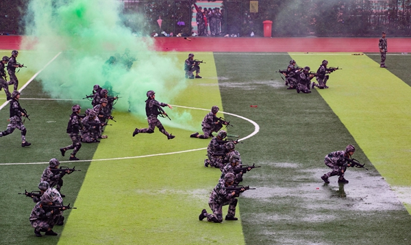 在随后举行的分列式和军训成果汇报表演上,受训新生先后进行了团体操、刺杀操、匕首操、防爆队形、特种战术、女子格斗术、教官表演,全场不时响起阵阵热烈的掌声。军训汇报表演结束后,党委副书记王立辉宣布军训表彰决定,院长宗平代表学院向受训教官赠送锦旗,表达对教官们的衷心感谢和崇高敬意。