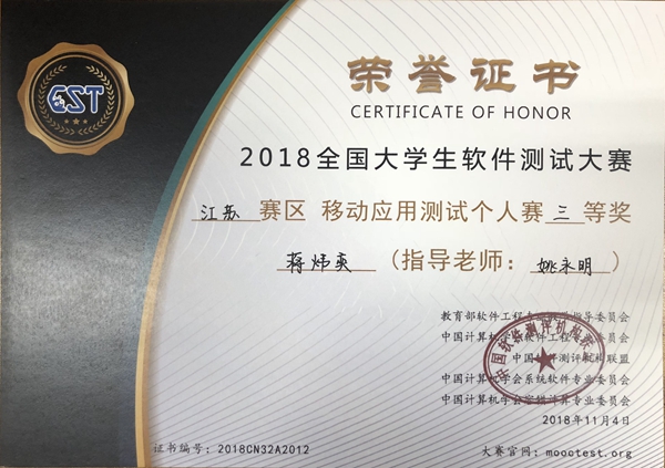 近日,2018年全国大学生软件测试大赛江苏省赛在金陵科技学院落下帷幕。必赢官网参赛队伍成绩喜人,共有8位同学获奖,其中2017级通信工程专业王育林同学获移动应用测试分项个人赛一等奖、2017级通信工程专业蒋炜奕同学获移动应用测试分项个人赛三等奖,7位同学分别获嵌入式软件测试分项优胜奖。