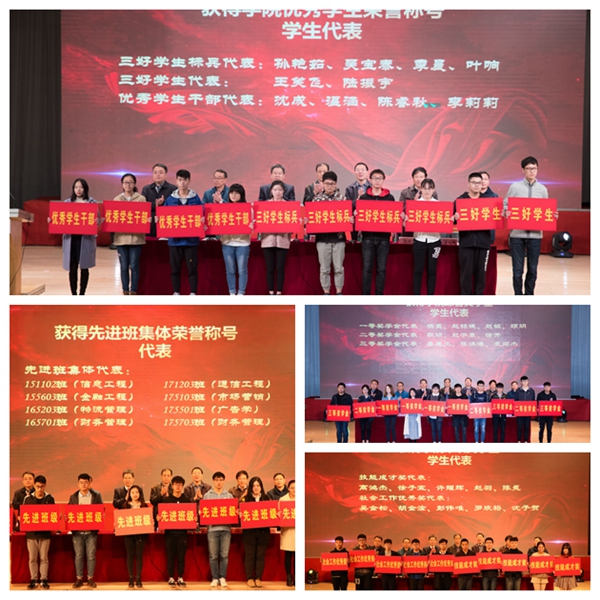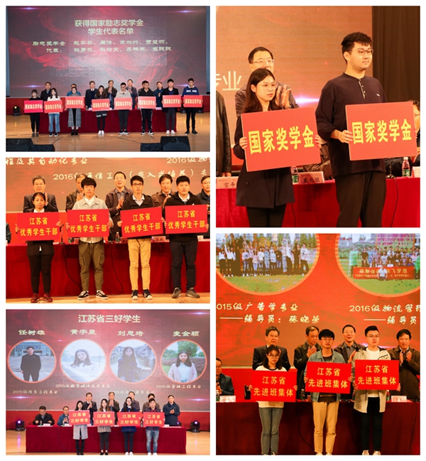 大会在庄严的国歌声中拉开帷幕。院党委书记戴兆骏宣读了《关于表彰2017/2018学年国家奖学金、国家励志奖学金获奖学生的决定》、常务副院长周西峰宣读了《关于表彰2018年江苏省三好学生、优秀学生干部和先进班集体的决定》、副院长包刚宣读了《关于表彰2017/2018学年优秀学生的决定》、副院长盛大铨宣读了《关于颁发2017/2018学年学生奖学金的决定》、党委副书记王立辉宣读了《关于表彰2017/2018学年先进班级的决定》。主席台领导为各类获奖学生代表颁发了荣誉证书。本学年,必赢官网共评出国家奖学金2人、国家励志奖学金138人、江苏省三好学生4人、江苏省优秀学生干部4人、江苏省先进班集体3个、院三好学生标兵54人、三好学生368人、优秀学生干部203人、一等奖222人、二等奖716人、三等奖925人、技能成才奖75人、社会工作优秀奖228人、第二课堂活动优秀奖8人、学习进步奖1439人、帮扶之星奖209人、院先进班集体10个。