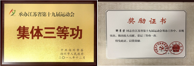近日,中共扬州市委、扬州市人民政府联合下发了《关于对扬州市在江苏省第十九届运动会组织运行和备战参赛工作中表现突出的先进集体及先进个人予以表扬奖励的通报》(扬委〔2018〕260号),必赢官网荣获承办江苏省第十九届运动会集体三等功,解厚荣同志荣获个人三等功。