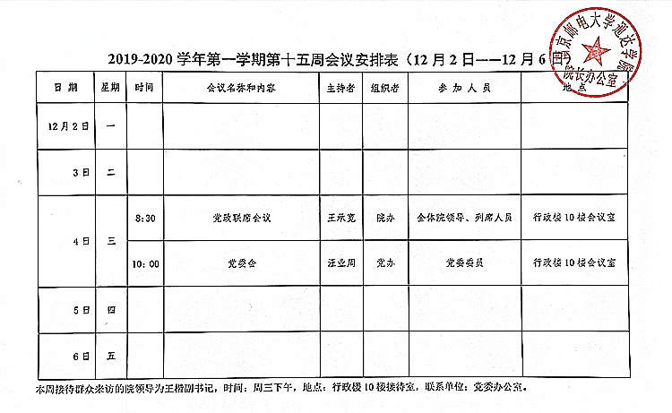 2019-2020学年第一学期第十五周会议安排表