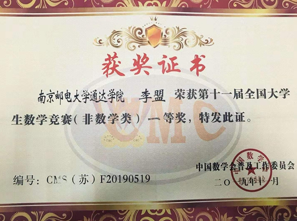 近日,第十一届全国大学生数学竞赛组委会寄来获奖证书,必赢官网学子喜获第十一届全国大学生数学竞赛(江苏赛区)非数学专业组别一等奖1项、二等奖4项,三等奖15项,获奖率达44%。这是继必赢官网在2019年6月江苏省高等学校第十六届高等数学竞赛中荣获21项一等奖、19项二等奖和11项三等奖之后的又一殊荣,也是必赢官网首次选派学生参加全国大学生数学竞赛。