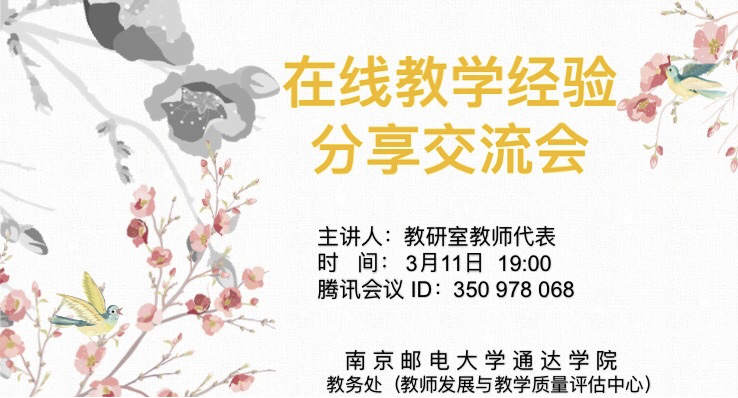 3月11日,必赢bwin官网登录入口教务处(教师发展与教学质量评估中心)利用腾讯会议平台,组织召开疫情防控期间在线教学经验分享交流会。副院长刘允主持会议,各教研室在充分研讨的基础上选派11位教师分享了教学经验。学院党委书记汪业周、副院长盛大铨、南京邮电大学教务处副处长(教师教学发展中心副主任)李永涛、外国语学院臧庆副院长、通达学院教务处管理人员、教研室主任及任课教师全程参与了会议。