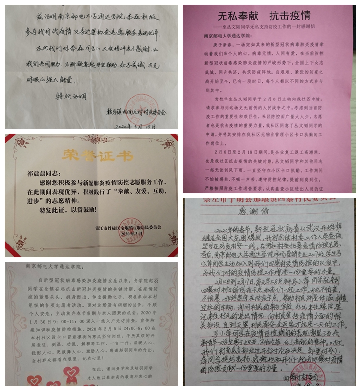 2017级通信工程专业谷志鹏同学也在家乡南京市高淳区报名参加了志愿防疫工作。他说:“国家有难,匹夫有责!身为一名班长,作为一名入党积极分子,我自愿加入到淳溪街道志愿者的行列当中去,贡献出属于自己的一份力量。南京市是江苏境内疫情比较严重的地区,所以很早就开始限制居民和群众的日常出行。好在我们区情况并不是很严重,但是为积极响应国家号召,不能有丝毫懈怠!我们仍然在每天做着同样严谨、负责的工作:每家每户发放通行证;对出入小区的车辆及车内人员进行检查登记和体温测量;严禁非小区人员随意出入本小区;及时向当地公安局治安警察大队汇报疫情情况。”“我相信国家,相信党中央,相信我们的医务工作者,相信我们的科研人员,疫情防控战,我们一定能赢!”