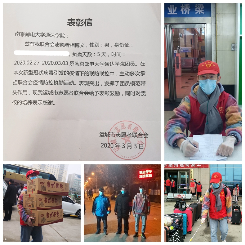 之后,相博文加入了一个志愿者群体,在城市间穿梭,为整个城市需要他们的人服务。他为抗疫民警子女开展线上辅导,线上讲解习题,切实做到了随时问随时答;他去做农民工复工大会的志愿者,帮助农民工填写资料、搬运行李、分发食物、协助登机,做一些力所能及的事;他去参加山西省运城市志愿服务工作,为援鄂返晋的战士修剪头发、整理行李,向奋斗在抗疫一线的医护工作者致敬。做志愿者的这段日子,所做的每一件事虽然琐碎,却让他倍感骄傲和自傲。他说:士不可以不弘毅,任重而道远。作为新时代中国青年,应该勇担时代赋予的重担,从身边的小事做起,从点滴做起,将小我融入大我,让青春在磨砺中绽放光彩。