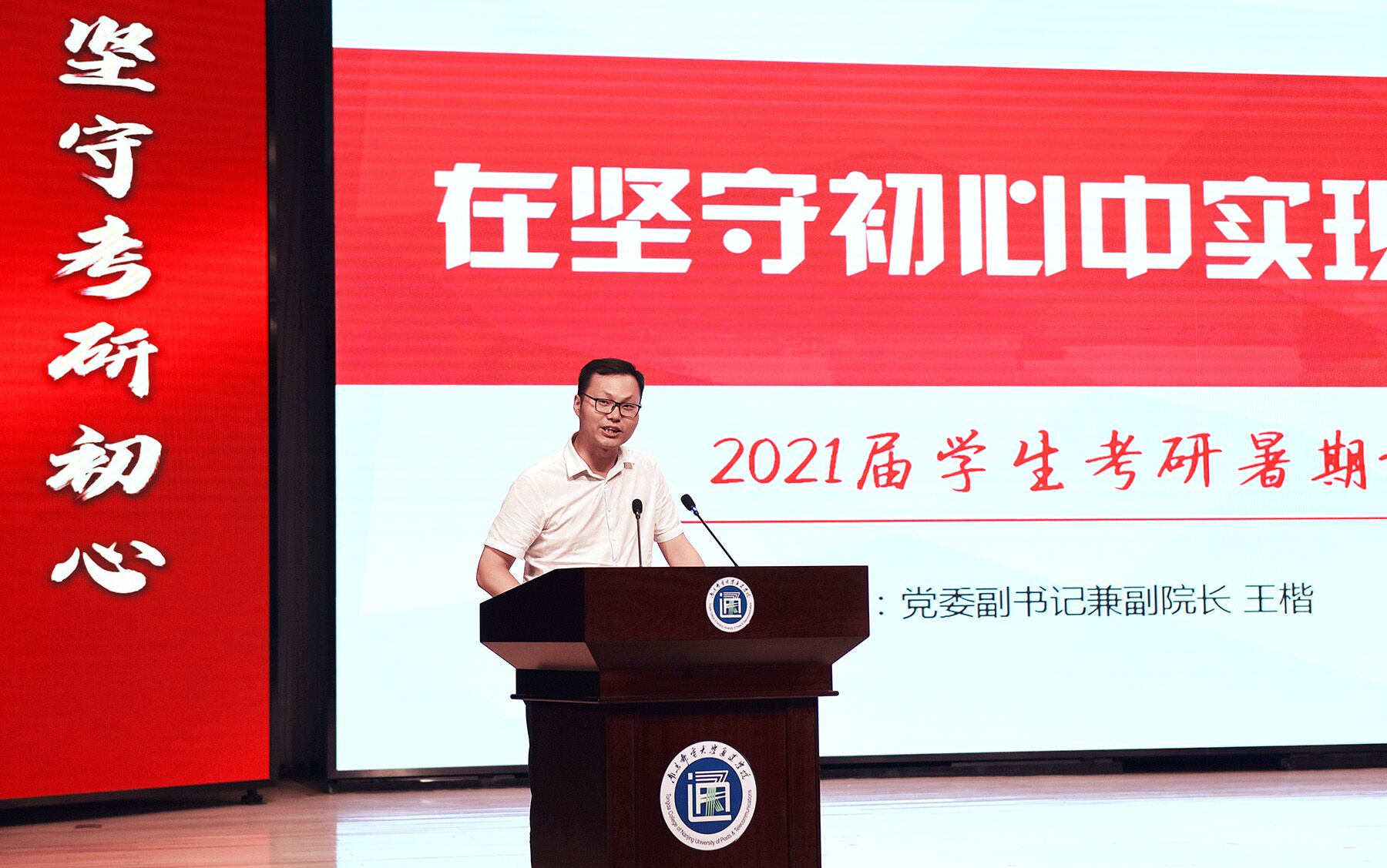 学院党委副书记兼副院长王楷作了《在坚守初心中实现考研梦想》的动员讲话。他给同学们分享了学院2020届的考研佳绩,结合必赢官网考研学生的典型案例和自己大学时期的学习经历,从坚守初心、坚定信心、坚持恒心三个方面鼓励同学们在考研的路上勇往直前,砥砺奋进,极大地鼓舞了同学们的士气。他希望考研学生能充分利用好这个暑期时间,执行考研计划,学会团队作战,充分利用好学校提供的资源,强化提升,收获战果。