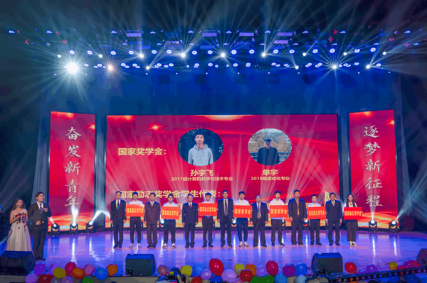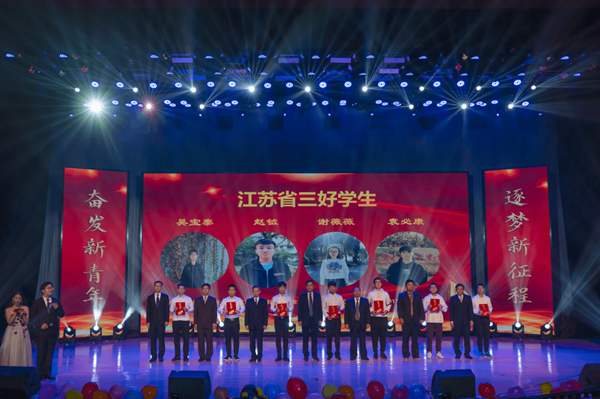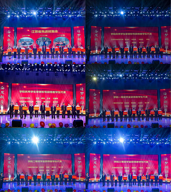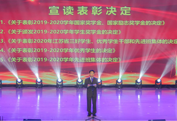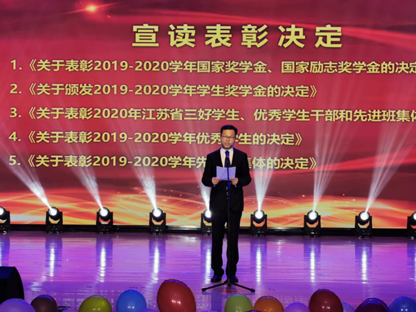 活动的第一篇章“炫彩·青春”在庄严的国歌声中拉开帷幕。副院长刘允宣读了《关于表彰2019/2020学年国家奖学金、国家励志奖学金获奖学生的决定》和《关于颁发2019/2020学年学生奖学金的决定》,党委副书记兼副院长王楷宣读了《关于表彰2020年江苏省三好学生、优秀学生干部和先进班集体的决定》《关于表彰2019/2020学 年优秀学生的决定》《关于表彰2019/2020学年先进班集体的决定》。学院全体领导为各类获奖学生代表颁发了荣誉证书。本学年,必赢官网共评选出国家奖学金2人、国家励志奖学金185人、江苏省三好学生4人、江苏省优秀学生干部4人、江苏省先进班集体3个,院级三好学生标兵61人、三好学生426人、优秀学生干部228人、一等奖243人、二等奖796人、三等奖932人、技能成才奖83人、社会工作优秀奖282人、第二课堂活动优秀奖21人、学习进步奖1447人、帮扶之星奖292人、先进班集体11个。