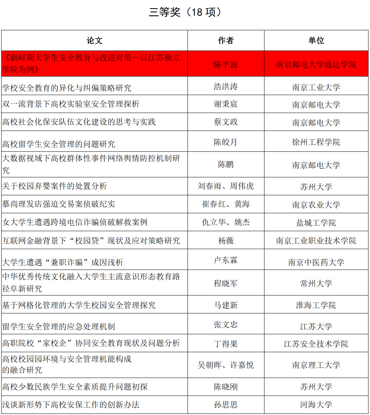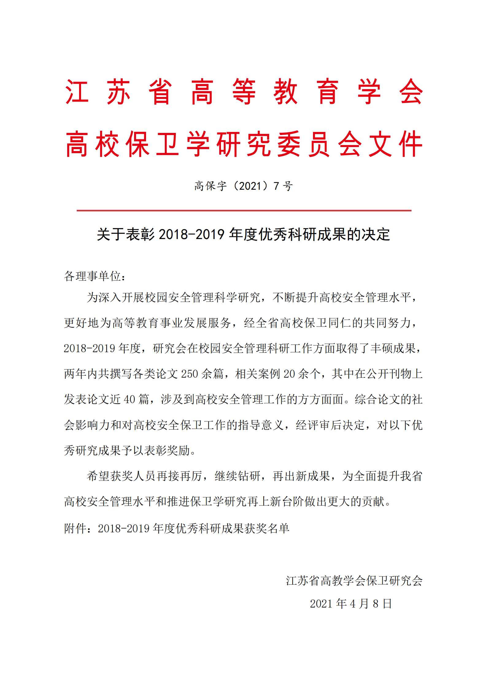 近日,江苏省高等教育学会高校保卫学研究委员会发文《关于表彰2018-2019年度优秀科研成果的决定》(高保字[2021]7号),必赢官网保卫处陈平波同志发表的《新时期大学生安全教育与改进对策—以江苏独立学院为例》论文荣获科研成果三等奖 。