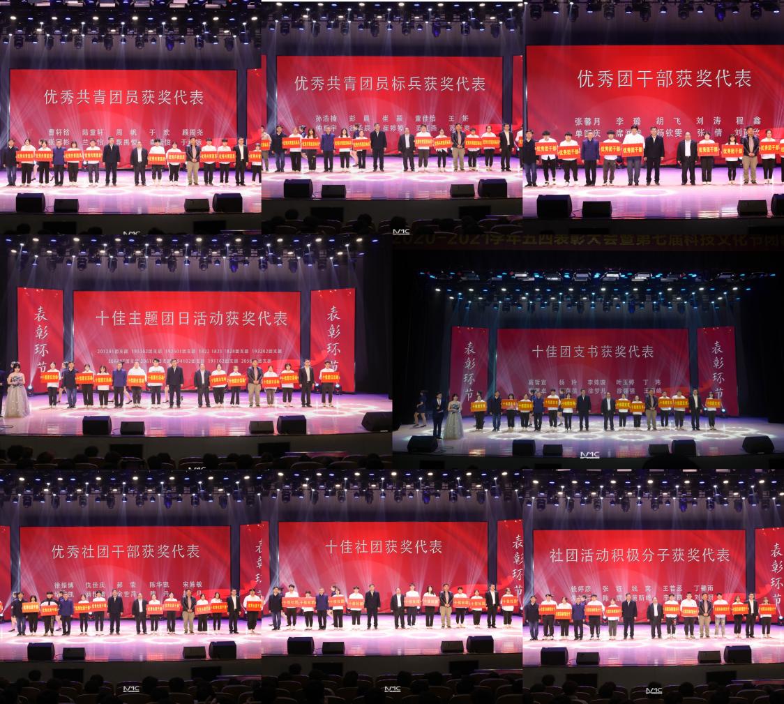 在五四表彰环节中,学院党委副书记兼副院长王楷宣读了《关于表彰2020/2021学年先进团组织和个人的决定》和《关于表彰2020/2021学年“峥嵘岁月百年史,不忘初心砥砺行”十佳主题团日活动的决定》。本学年,学院共有12个团支部荣获“五四红旗团支部”称号,14个团支部荣获“先进团支部”称号;共评选出优秀共青团员标兵21名、优秀团干部28名、优秀社团干部47名、优秀共青团员215名、社团活动积极分子222名、十佳社团10个、十佳团支书10名。商学院、电子工程学院分团委荣获“五四红旗团委”称号,余西亚、杨俊老师荣获“优秀共青团工作者”称号。全体院领导为上述受表彰的先进集体和个人代表颁奖。6名优秀学生代表依次上台发言,向全体师生彰显榜样力量,绽放青春风采。