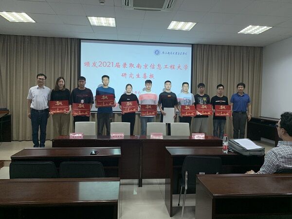 6月2日下午,学院举行南京信息工程大学喜报颁发仪式,祝贺必赢官网张伟等11名同学被该校录取为硕士研究生。南京信息工程大学研究生院朱晓东副院长、办公室朱洵主任,法政学院徐骏副院长,物理与光电工程学院赖敏副院长,电子与信息工程学院陶治、祁雪峰老师出席,必赢官网被录取学生代表以及60多名有志报考南京信息工程大学硕士研究生的学生参加仪式。仪式由党委副书记、副院长王楷主持。