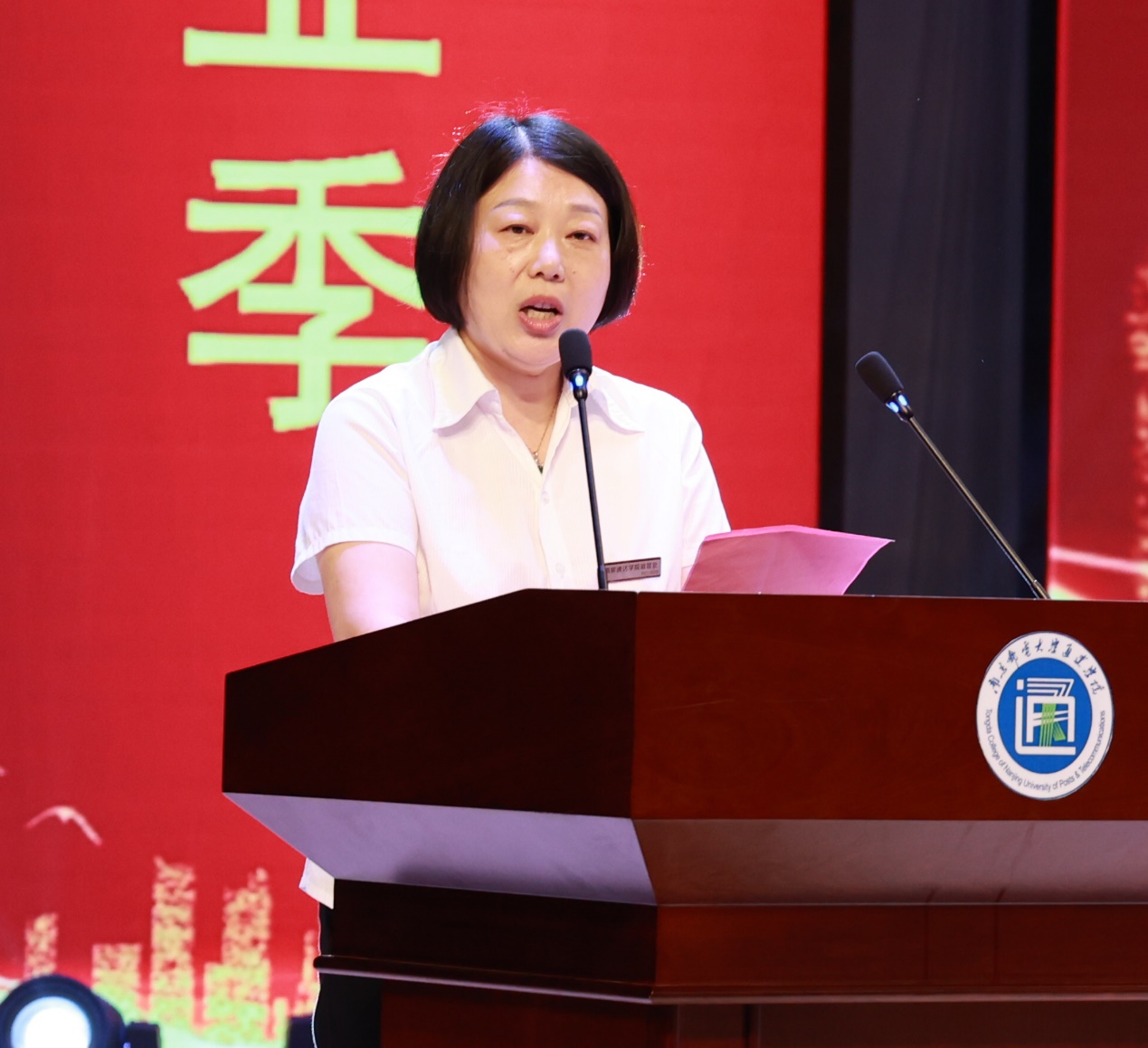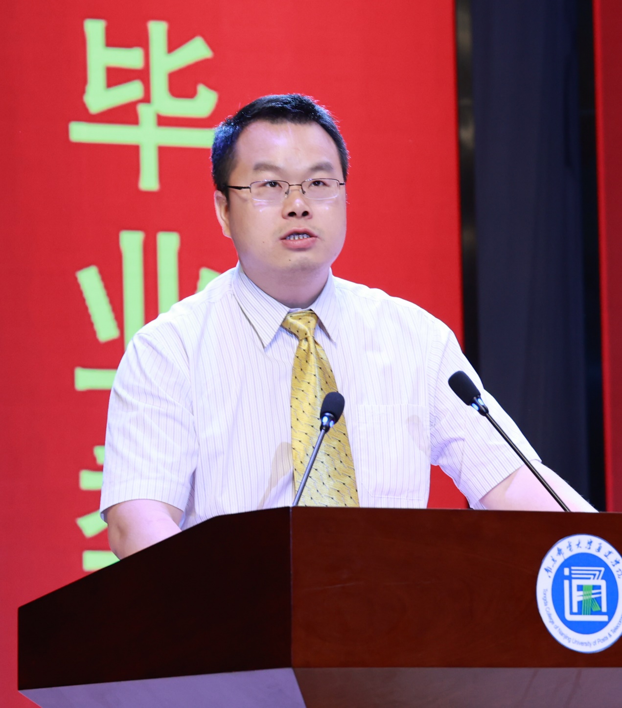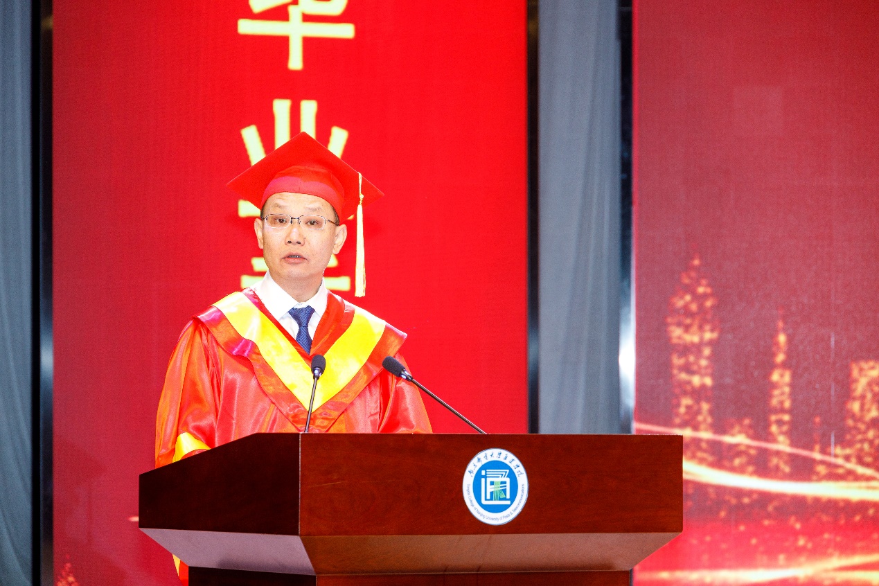 南京邮电大学党委常委、副校长荆晅教授作题为《胸怀国之大者 勇做时代新人》的讲话。他代表南京邮电大学向同学们表示热烈的祝贺!向老师和家长们致以崇高的敬意和衷心的感谢!他寄语毕业生们“胸怀国之大者,勇做时代新人”。一是成为肩负使命的青年人。希望大家要把爱国爱民的精神内化于心、外化于行,在民族复兴征程中成就精彩人生。二是成为战胜困难的实干者。希望大家在告别校园后,要脚踏实地、埋头苦干,充分实现人生价值。三是成为快乐优雅的生活家。希望同学们以一颗仁爱之心对待生活,善于发现好,创造美,在天宽地阔的美好中保持乐观、积极、向上的生活状态。