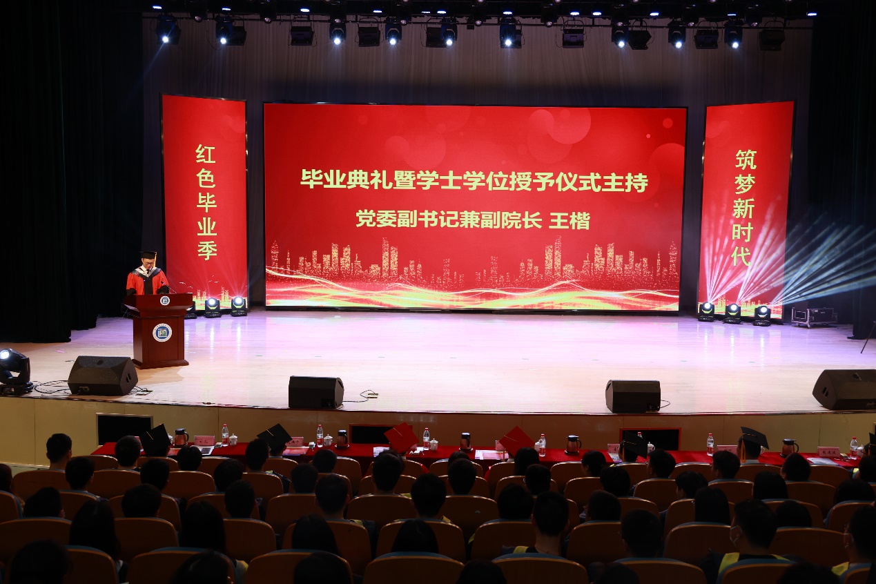 六月芳华,通达骊歌,又是一年毕业季。6月22日上午,“红色毕业季 筑梦新时代”——2021届本科生毕业典礼暨学位授予仪式在必赢官网大学生活动中心礼堂隆重举行。南京邮电大学党委常委、副校长荆晅教授,全体院领导出席典礼。各职能部门和二级学院负责人、2021届毕业生、家长代表、教师代表和宿舍管理员代表等参加了典礼。毕业典礼由党委副书记兼副院长王楷主持。