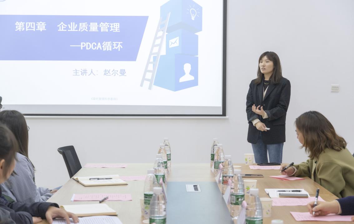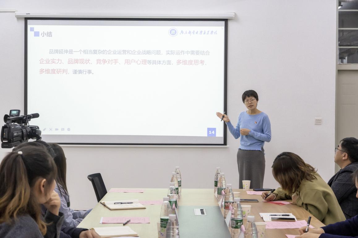 随后,在“聚焦人才培养 提升教学能力”青年教师示范课环节,商学院教师党支部纪花老师、入党积极分子赵尔曼老师分别为大家带来了《品牌延伸》和《PDCA循环管理》示范课。两位老师通过案例教学、视频教学、课堂讨论等方式,充分展现了商学院青年教师的授课风采;通过观摩课程思政教学示范,与会老师们对于进一步充实课程内容、提升课程内涵价值形成了较为深入的认识和理解。南京邮电大学刘宁教授和王娟教授对示范课进行了点评,并高度评价了商学院青年教师的教学能力和水平。随后,老师们围绕课程思政建设、翻转课堂建设、专业课程设置等方面进行了深入的探讨与交流。