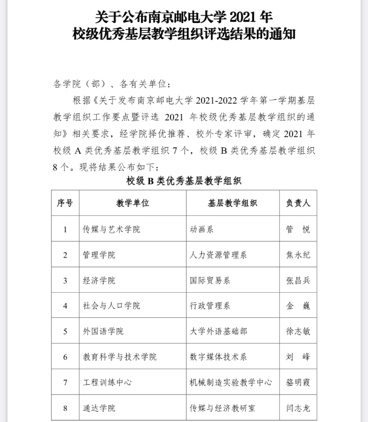 南京邮电大学2021年校级优秀基层教学组织评选结果于近日公布,共评选出2A类优秀基层教学组织7个,B类优秀基层教学组织8个。必赢官网传媒与经济教研室顺利入选2021年度南京邮电大学校级B类优秀基层教学组织。
