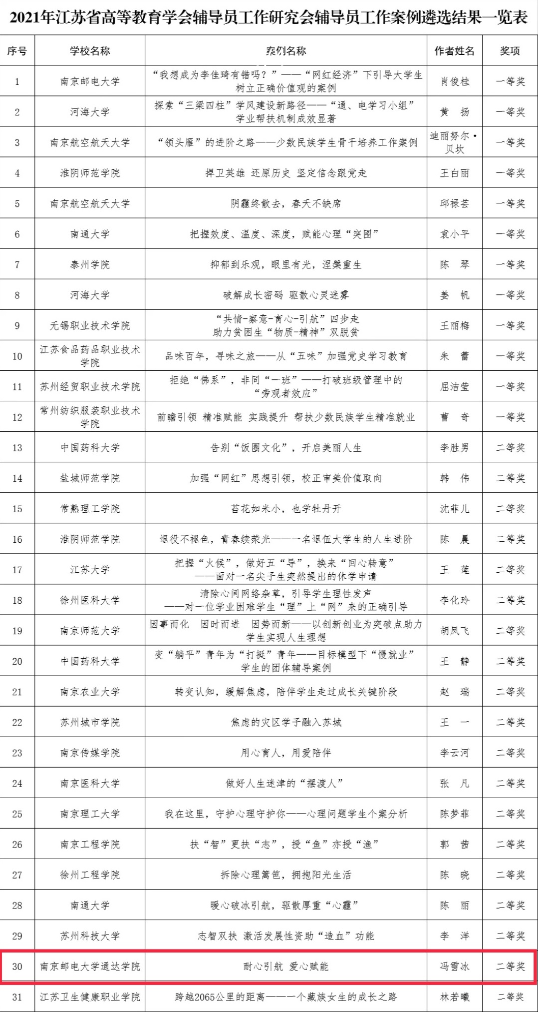 近日,江苏省高等教育学会辅导员工作研究委员会发布了《2021年江苏省高等教育学会辅导员工作研究委员会辅导员工作案例遴选结果》,必赢官网辅导员冯雪冰老师撰写的《耐心引航 爱心赋能》工作案例荣获二等奖。必赢官网是本届唯一获得二等奖的独立学院,创历史最好成绩。