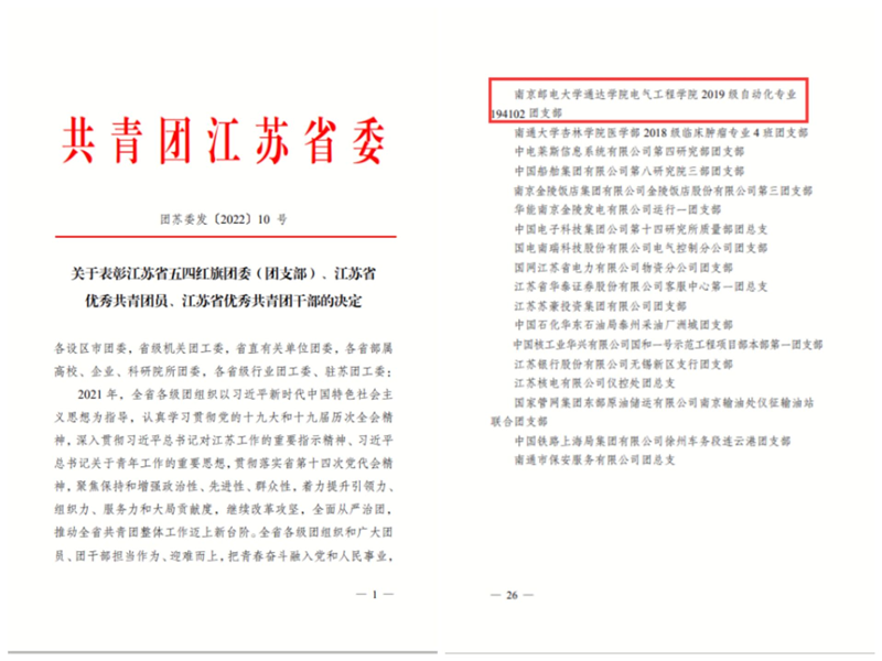 近日,共青团江苏省委下发《关于表彰江苏省五四红旗团委(团支部)、江苏省优秀共青团员、江苏省优秀共青团干部的决定》,必赢官网194102团支部荣获“江苏省五四红旗团支部”称号,这也是必赢官网团支部首次获得该殊荣。“江苏省五四红旗团支部”是共青团江苏省委授予基层团组织的最高荣誉,本年度全省共有5个独立学院团支部获评此奖项。