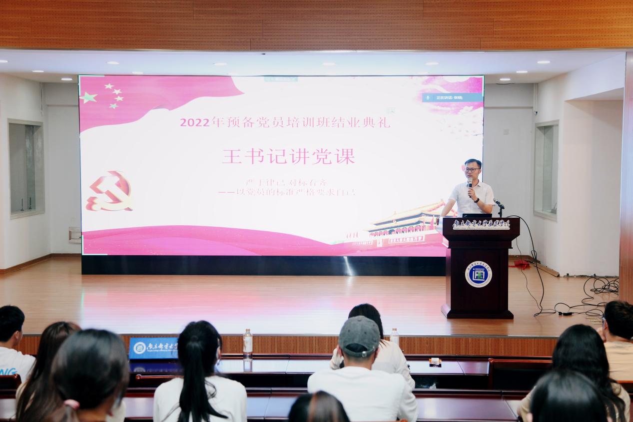 王书记对顺利结业的全体学员表示祝贺,对培训班老师的辛勤付出表示感谢。随后他以《严于律己 对标看齐——以党员的标准严格要求自己》为题作专题党课。王书记对党校学员提出了三点希望:一是志存高远、树立远大的共产主义信念,鼓励青年党员找准自身价值,主动将个人的理想追求融入到党和国家的事业之中;二是养成勤学善思、终身学习的良好习惯,做到真学、真懂、真信、真用;三是笃行实干、在实践中争做先锋,严格要求自己,在坚定政治立场和提高素质能力上争做先锋,发挥党员的先锋模范作用。最后告诫即将毕业的党员们在未来的日子里要始终不忘入党初心,并号召青年党员要把握时机,艰苦奋斗,自觉担当起时代的责任。
