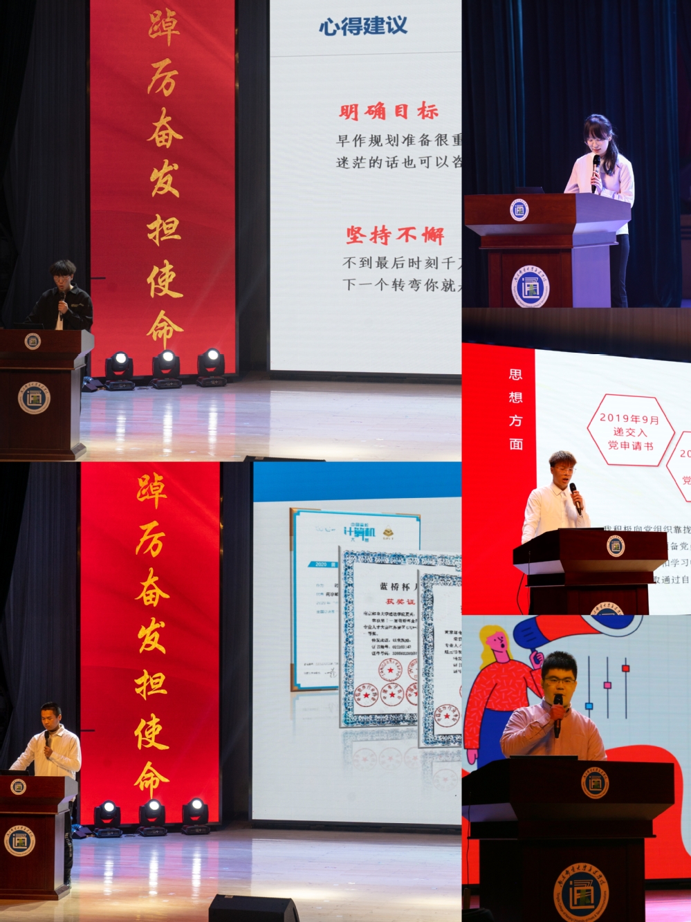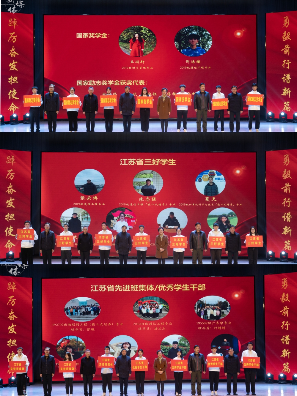 国家奖学金获得者郑浩楠(通信工程学院)、国家励志奖学金获得者温浩(电气工程学院)、江苏省三好学生夏天(计算机工程学院)、江苏省优秀学生干部贾付渺玥(计算机工程学院)、江苏省先进班级195502班代表蒲海涛(商学院)作为先进集体与优秀学生代表,向现场观众分享了他们在学习科研、竞赛实践、社会服务、组织建设等方面的成功经验。激励同学们与榜样同行,勤学善思,积极进取,全面提升综合素质,助力个人全面发展。