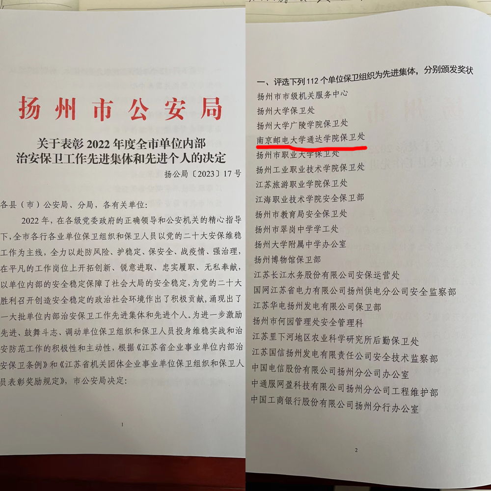 根据扬公局【2023】17号文件获悉必赢官网保卫处再次被扬州市公安局评为《2022年度全市单位内部治安保卫工作先进集体》。