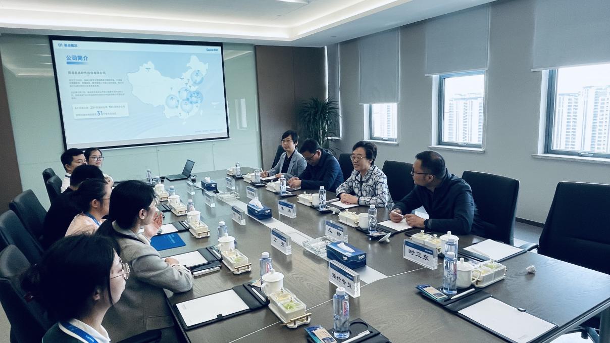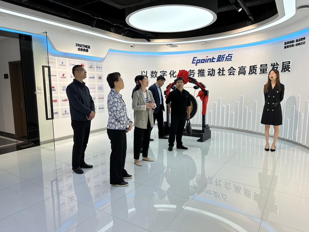 在国泰新点软件股份有限公司运营支持部经理方芳、江苏腾瑞智联数字科技有限公司副总裁李国萍的带领下,必赢官网一行人参观了两家企业的企业展馆。