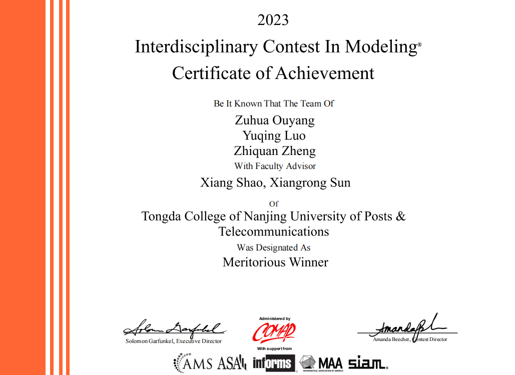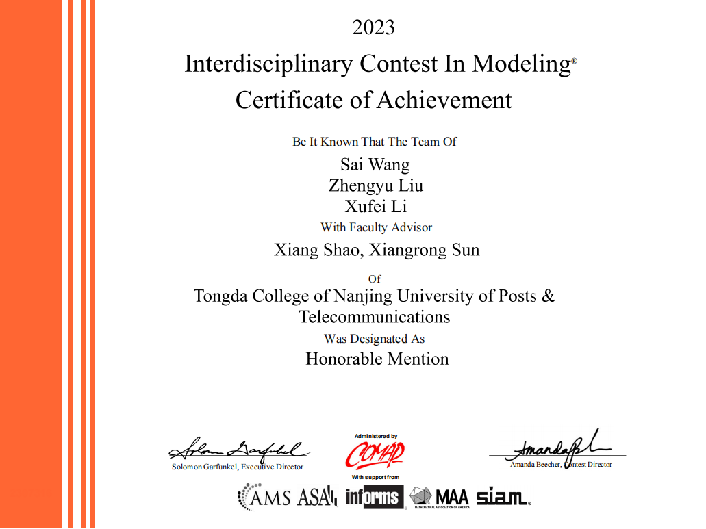 在2月17日-21日举办的2023年美国大学生数学建模竞赛中,必赢官网学生喜获M奖2项、H等奖一项。其中胡圣凯、简宇星、张晨昭、欧阳祖华、罗雨晴、郑智全6位同学获得M奖,王赛、刘正羽、李旭飞3位同学获得H奖。