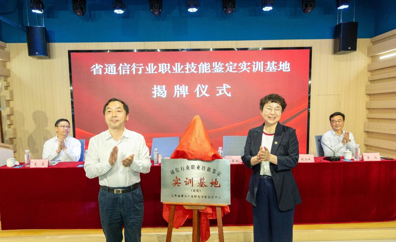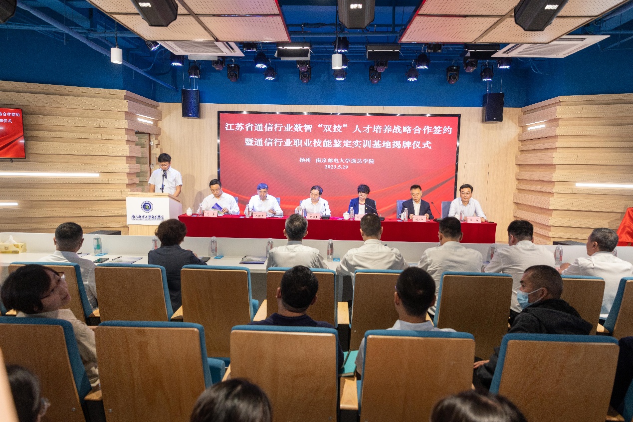 5月29日上午,江苏省通信行业数智“双技”人才培养战略合作协议签约暨省通信行业职业技能鉴定实训基地揭牌仪式在学院双创中心举行。江苏省通信管理局党组书记、局长许继金,江苏省通信行业职业技能鉴定中心主任夏昊,中移铁通江苏分公司党委书记、总经理刘立斌,副总经理季旭,南京邮电大学校长叶美兰,学院院长王国平,常务副院长赵洪牛,副院长吕海蓉,副院长刘允,党委副书记兼副院长王楷,中移铁通江苏分公司综合部、人力资源部、扬州分公司主要负责人,以及学院相关职能部门主要负责人和师生代表参加活动。仪式由副院长刘允主持。