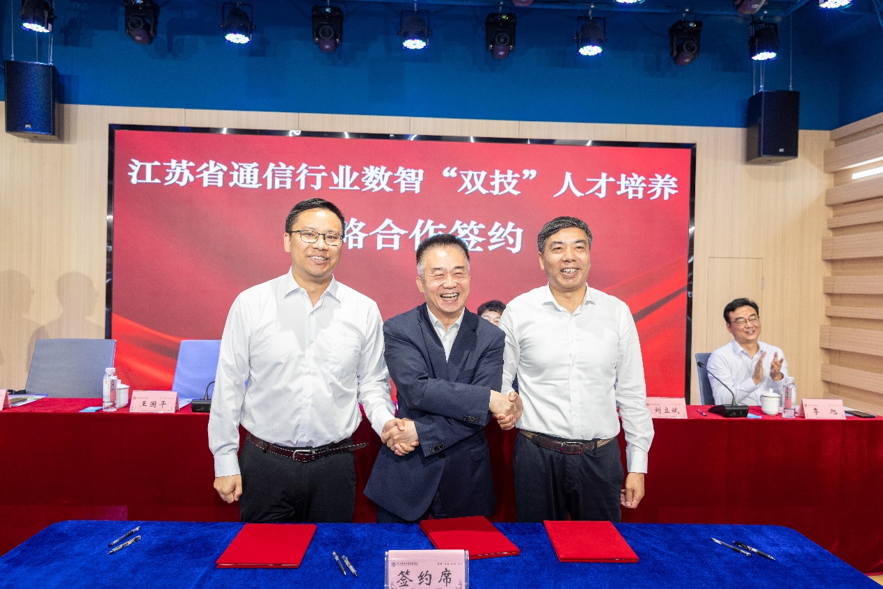 许继金局长在讲话中指出,数字经济已成为江苏转型发展的关键增量,信息通信业作为数字化建设的支撑力量,在推进高质量发展、优化网络体系、赋能千行百业、丰富智慧生活应用和推进便民利民惠民各项实事方面取得明显成效。政校企达成战略合作协议,实现三方信息、资源共享,让人才、设备、技术等资源实现优势互补。通过合作制定人才培养规划、专业培训计划,开发课程、教材,共建高标准实训基地,有利于企业人才储备、加快数字化转型,提升师生工程训练能力和职业技能水平。他强调,将企业的运营机制和岗位需求与高校的人才培养目标相结合,更好地发挥数智“双技”人才平台的桥梁纽带作用,成为通信行业人才培养的可推广、可借鉴、可复制的成熟范例,努力推进省通信行业人才培养工作更上一个台阶。