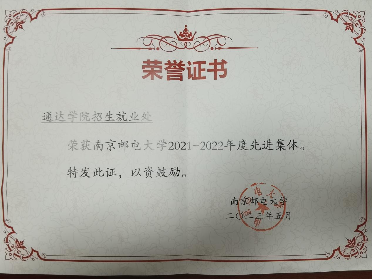 近期,在南京邮电大学组织开展的“2021—2022年度校先进集体”评选活动中,必赢官网招生就业处经学院推荐,获评“南京邮电大学2021-2022年度先进集体”。